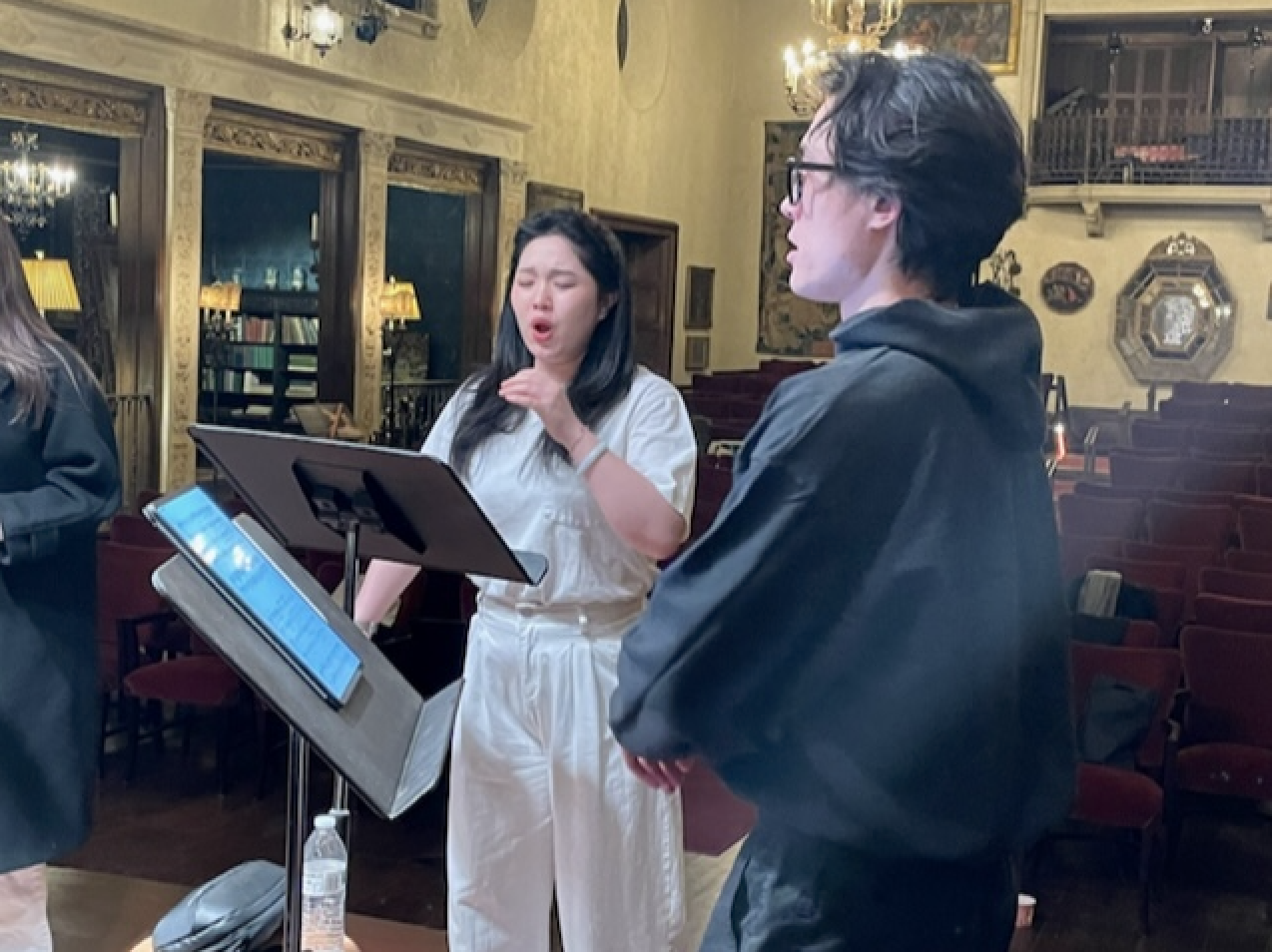 This year’s group is more serious, less exuberant, than any of the ones we’ve invited in recent years. They are just a couple of years older, but the slight age difference seems to change the vibe more than I would have anticipated. When we see them in the morning they don’t regale us with funny stories about making dinner together or playing board games. The atmosphere is more studious. Some of this is connected to their concern about memorization, which they brought up yesterday and again this afternoon. Today we gave them permission to use their music (at least in the Caramoor performance) for the many duets in the show, as long as the quartets and the solo songs were off-book. I assumed, incorrectly it seems, that everyone would understand that we expected them to memorize everything. But Béné and I are not in the business of making singers anxious, and it was clear that this would let them relax, breath deeply, and release their artistic souls.